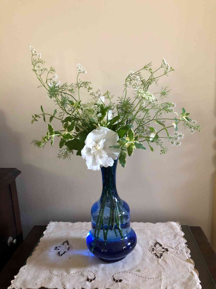 暑いのでスッキリ白と緑2色にまとめてコバルトブルーの花瓶に生けました。 花材はqueen Ann’s lace(クイーンアンズレース)、white rose of sharon(白ムクゲ)、cilantro(シアントロ/パクチー)、phlox(フロックス)、pineapple mint(パイナップルミント)です。 シアントロやミントは強い匂いがあるので、お客様が来る時、テーブル花には使えませんが、個人的にこの香りが好きでお花もかわいいので私はたまに使います。ポイントは白いムクゲの隣に寄せたミントです。正面に真っ白い花が来ると表情に欠けるので、柔らかさをだすために、、、