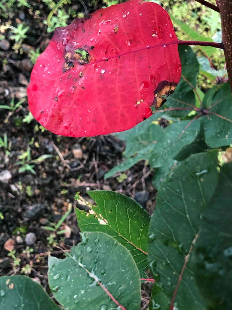 1枚目の影になってるスモークツリー、葉っぱが1枚だけ こんなに綺麗な🟥赤に(*^▽^*)