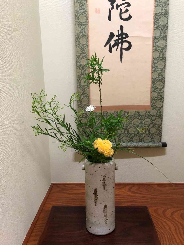 雨が止まりません☔️雨で折れそうな枝を活かせたらと1人ぼっちの黄色いケイトウと最後になったノコギリ草を入れてみました。