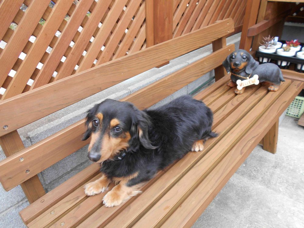 ベンチで同じような姿勢(^^♪ 🐕置物よりオレのほうが可愛いだろ?(^^)