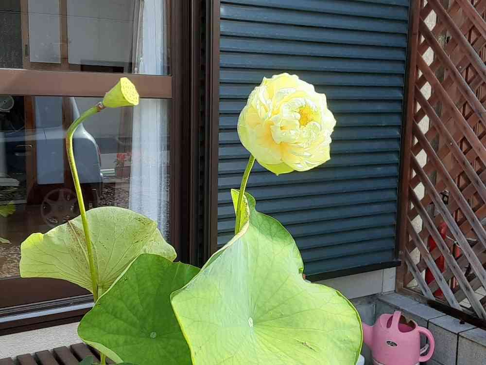 昨日迄はつぼみだった、縁側の前の黄色八重咲きの蓮の花、二輪目が五分咲きに成りました。