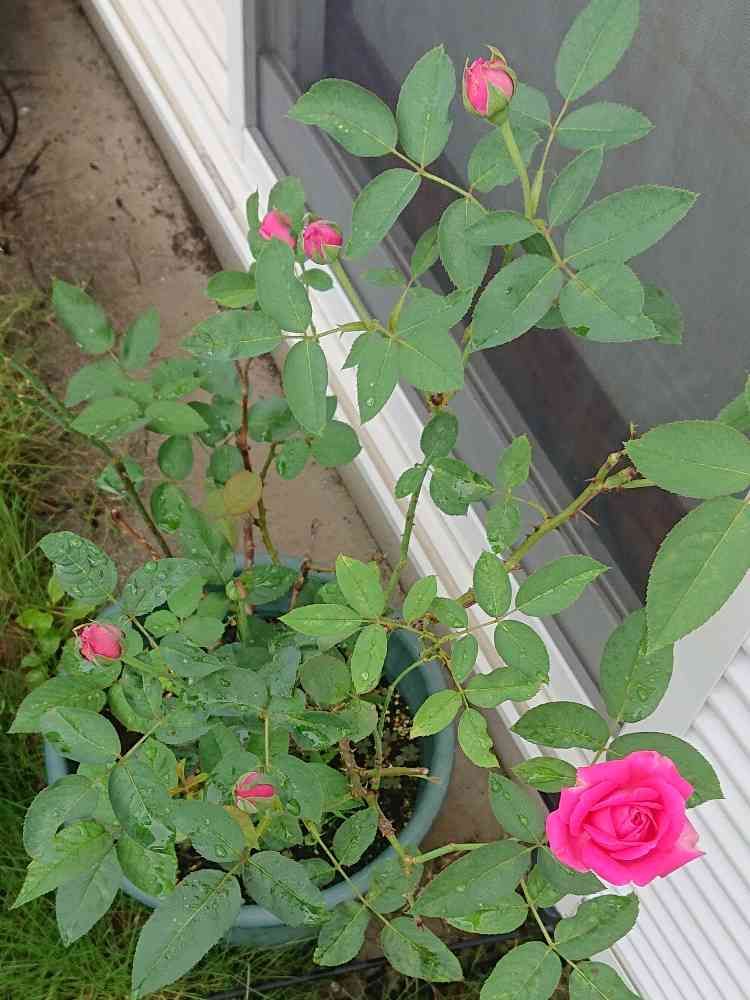 雨☔を 避けて 軒下に移動したおかげか 元気に 育って 薔薇🌹(タグが 不明で 名前わからず😣)が 咲きだしました⤴️🙌