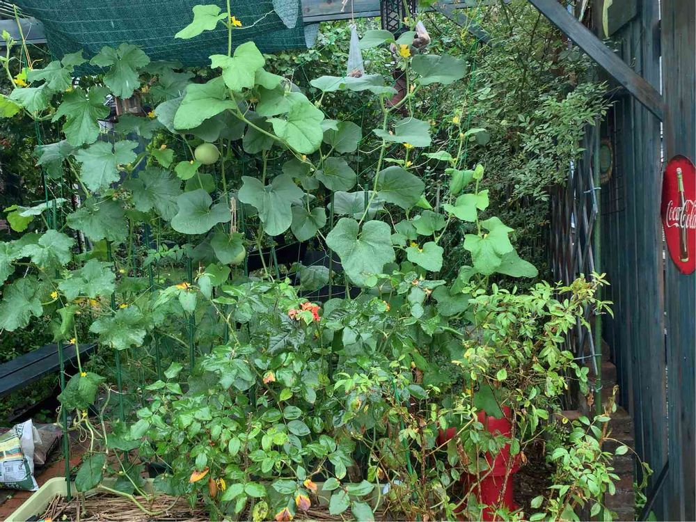 メロン🍈ツルのグリーンカーテン、の予定でしたが思いのほか葉っぱが大き過ぎてカーテンの裏側のテーブルスペースは日が全く当たらなくなり昼でも真っ暗になりました💧