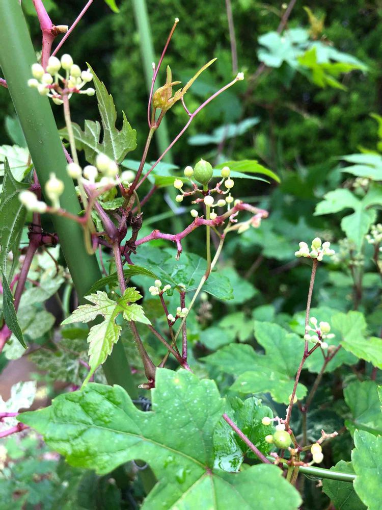 長雨で、心配しましたが、元気そうです。緑の実、小さな花がたくさん付いてます。でも、よく見ると穴が空いたり茶色になったりしている葉っぱが、、、💦