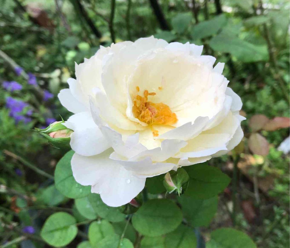 一番花の時に撮影タイミングを逃し二番花です。初pic🌹昨日の大雨の中咲いていたようです。大輪で傷まずきれい✨でも確か薄ピンクだったと思うけど白い〜なぜかな?