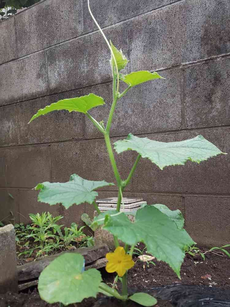 留守中にきゅうり🥒に可愛い黄色の花が💛~支柱も無いのに綺麗に立ってる🤩✨ネットをセットしなければ❗️😅