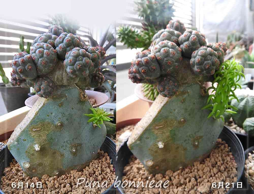 サボテン、プナ・ボンニアエ。ウチワサボテンに接いであるんだけど、台木のウチワサボテンの成長が早い。たった一週間で脇芽がこのとおり。これではボンニアエに栄養がいかなくなるので、削り落とす!