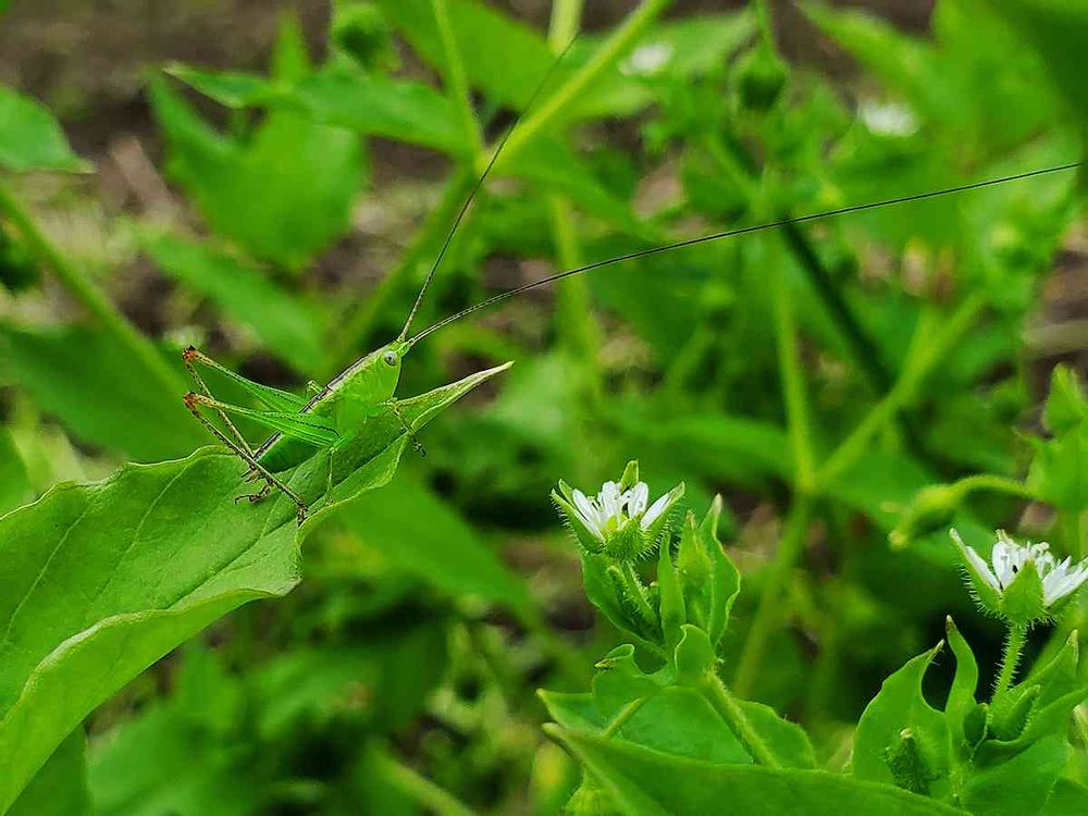 ウシハコベ(牛繁縷)とホシササキリ(星笹螽蟖)の子ども
