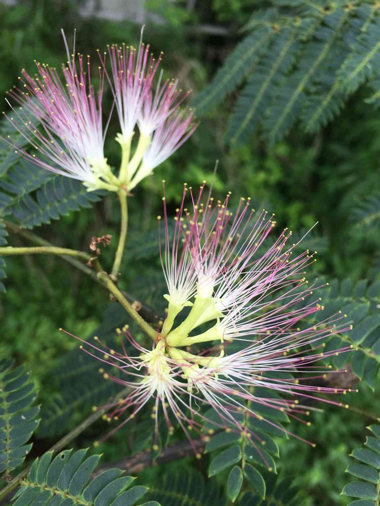 合歓の木。落葉高木。夜になると葉をたたんで垂れ下がり眠る。この就眠運動をすることに名は由来する。合歓は、歓びが合わさる祝賀の木という中国名。