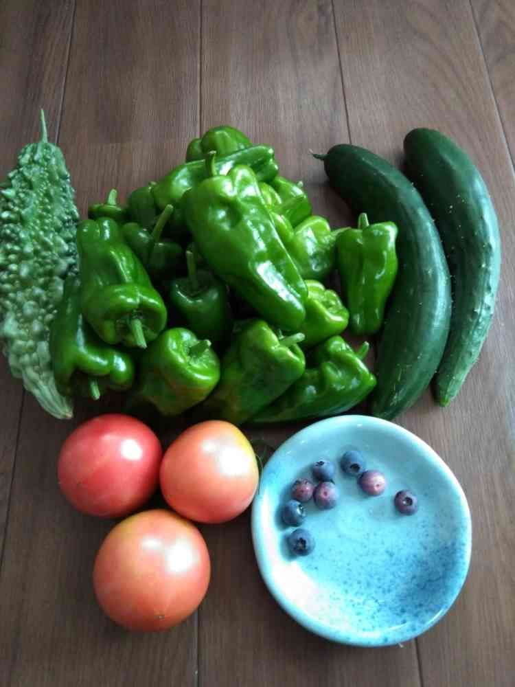 今年はピーマンが豊作🎶ブルーベリーは鳥さんがみんな食べちゃう💦申し訳なさそうにおこぼれ🤣