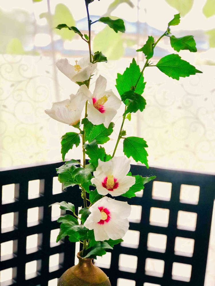 庭に木槿が咲きました、裏千家お家元三代元伯宗旦お好みの花です。その為宗旦木槿とも呼ばれます。また其の姿かたちから底紅とも呼ばれる楚々とした花です。