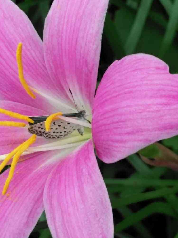 小さな蝶々がゼフィランサスの花の蜜を吸いに来ていました。