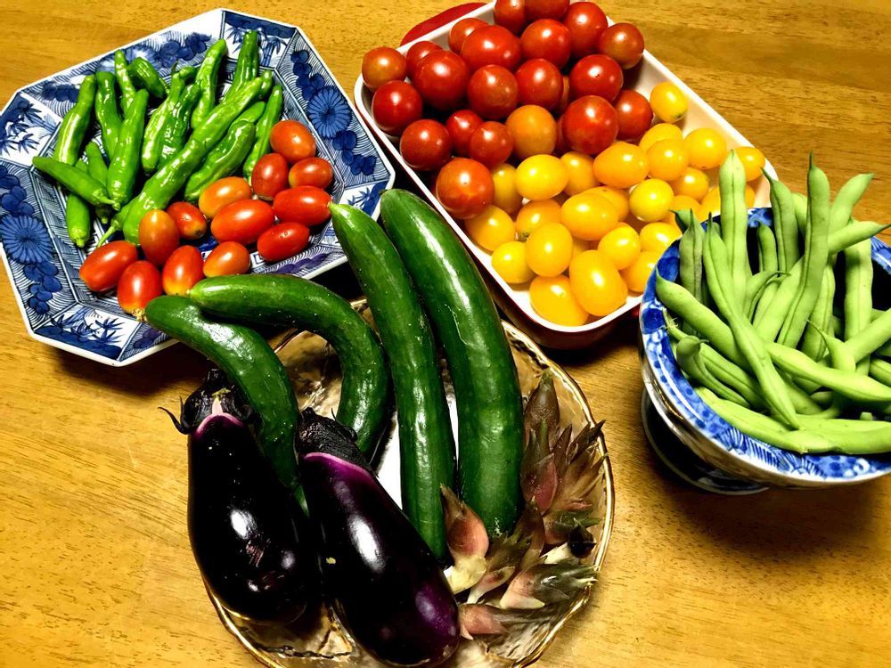 ナス、キュウリ、ミニトマト、インゲン、シシトウ、ミョウガ