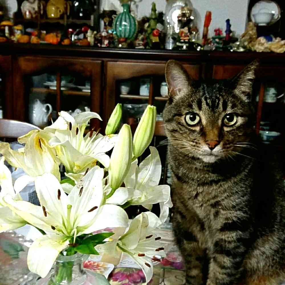 テーブルの上の百合が美味しそうなんでチェックしたニャ~😸