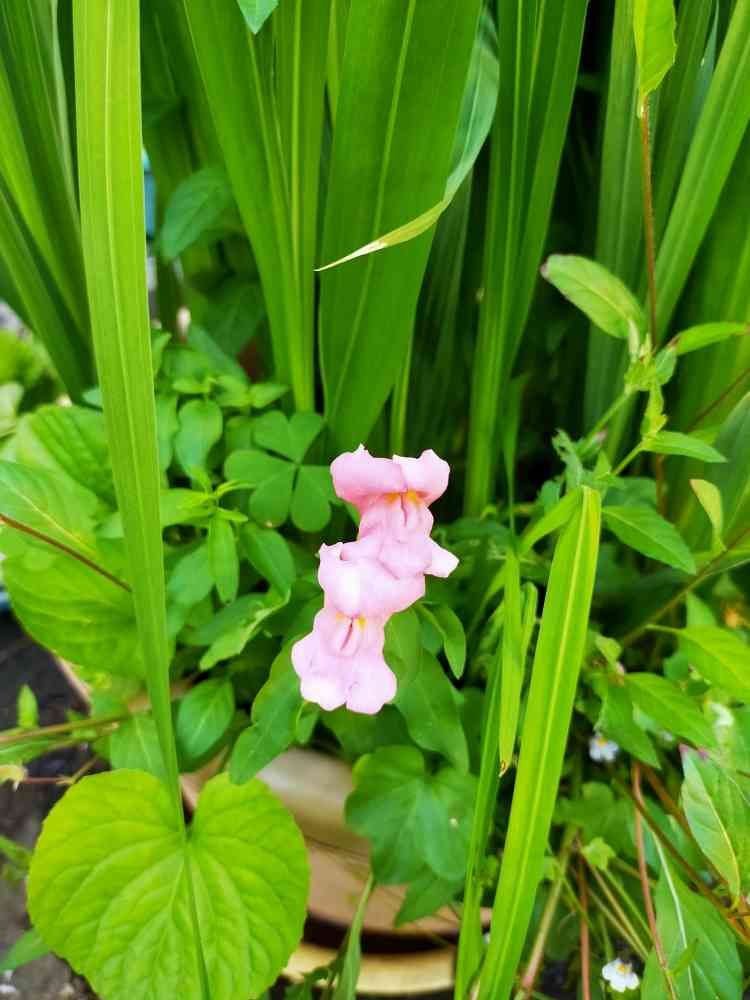 グラジオラスの鉢からピンク色の金魚草と思われる花が😉ラツキー