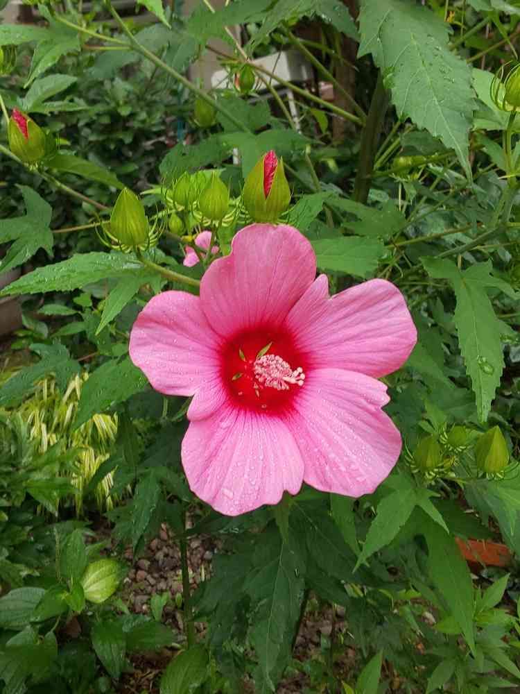 赤の紅葉葵から種がこぼれももいろが咲くようになりました 小さな庭は赤やももいろ白やピンクの芙蓉 大きな花で賑やかです