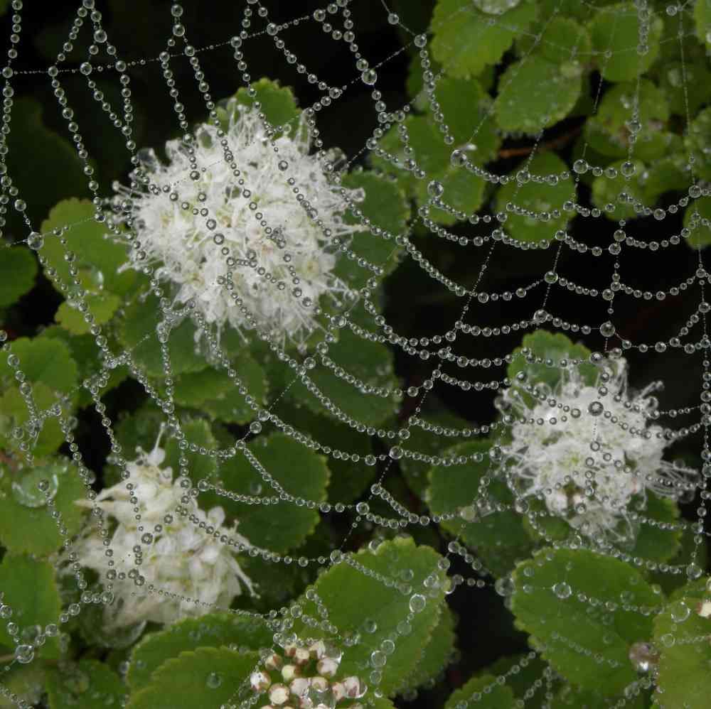 霧雨の中窮屈な姿勢で写真を撮っていましたが、こんなにキレイなビーズとは思っていませんでした。家主がいたら、鎖で囚われのマルバシモツケになってしまいますね。