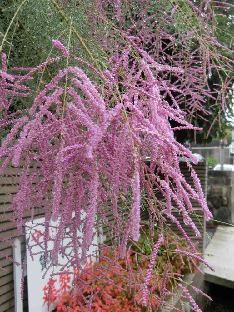 細い枝をアーチ状に伸ばしてピンクの小さな花を咲かせているギョリュウ。