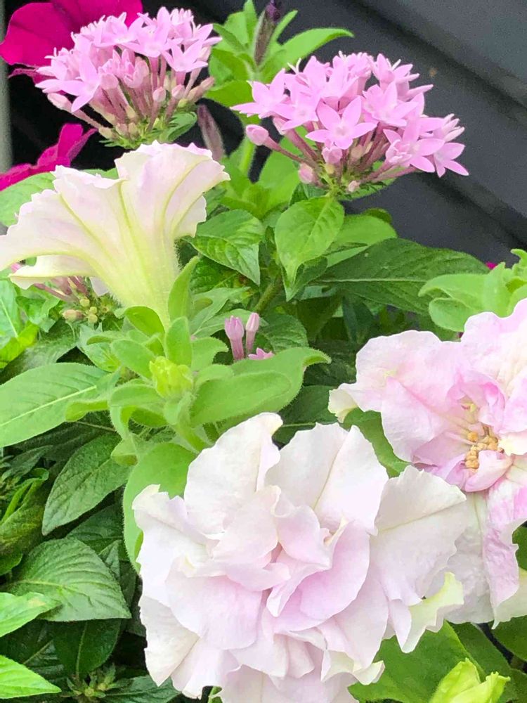 八重咲きペチュニア、ペンタスなど、ピンク系の可愛い花々中心の寄せ植え🌸