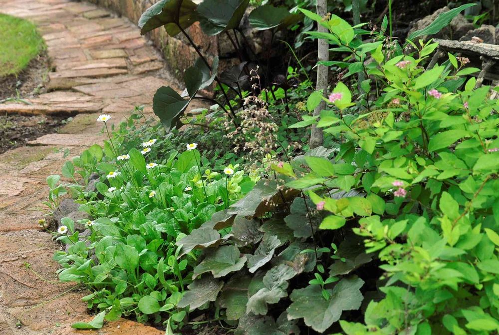 イングランドデイジーか小道の脇に咲いてます。リグラリア、ツボサンゴの銅葉とシモツケのライムグリーンのコントラストがいい味出してます。