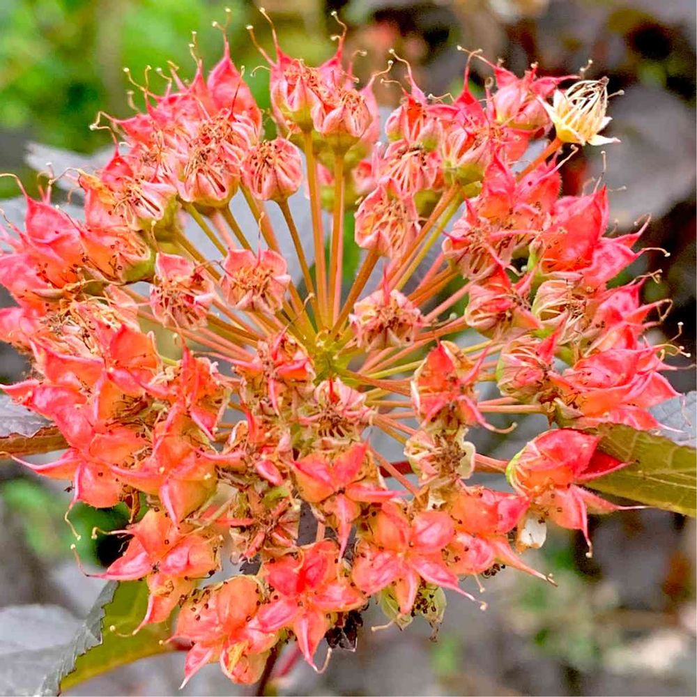 アメリカコデマリ(テマリシモツケ)の白い花が終わり鮮やかな赤に変化していました