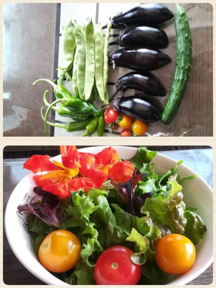 今朝採れ野菜と昨日頂いた食べれるお花🏵️ナスタチウム(キンレンカ)のサラダ