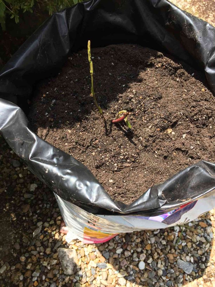 食べかけ長イモ。鉢上げして根が出て、新しい芽も動き始めたので、袋栽培に定植しました。詳しくはみどりのまとめで😃