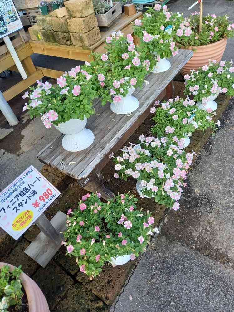 近所のHCに、サフィニアアート ももいろハート🍑💗が、こんなに売ってます💡