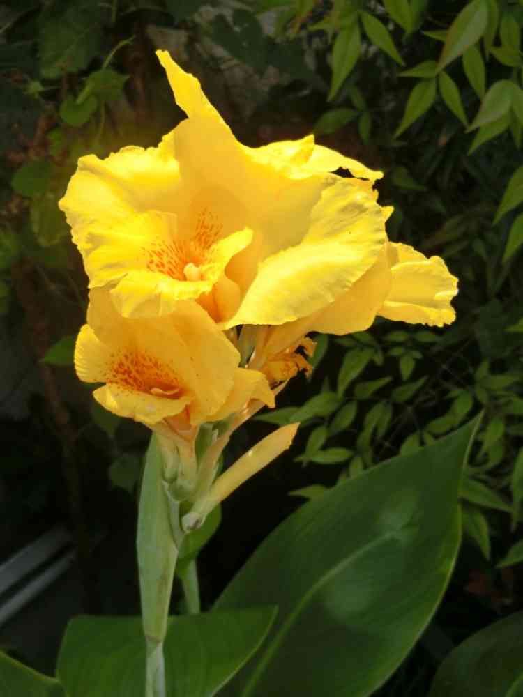 大きな葉っぱの間から鮮やかな黄色の大輪を咲かせているカンナ!