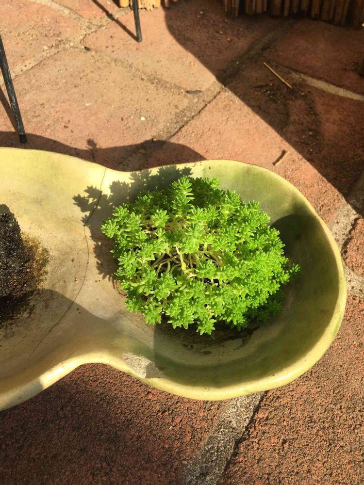 砂利の上に出現したセダムを、苔玉の残がいに乗せてみました。新たなセダム玉ができる予定。お皿は母が作ったひょうたん型