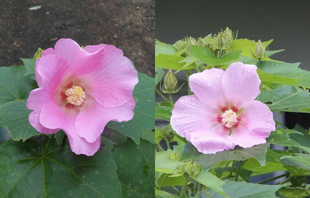 左側の芙蓉は濃いピンクに引き寄せられ、10m程の階段を駆け上がりpicしました。よく見るとアスファルトの裂け目から生えていました。 😲