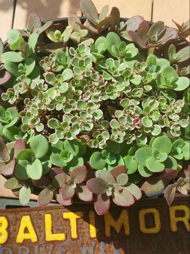 こんばんは🤗セダムって言うんですね!多肉ちゃん名前詳しくないけど、よく聞くような気がします。🤔赤ぽい錆色のがあるからポイントになってますね。ちょっとでオシャレ度アップしてます。Baltimoreの文字と色古い錆感がセダムを引き立てていて素敵です。💖