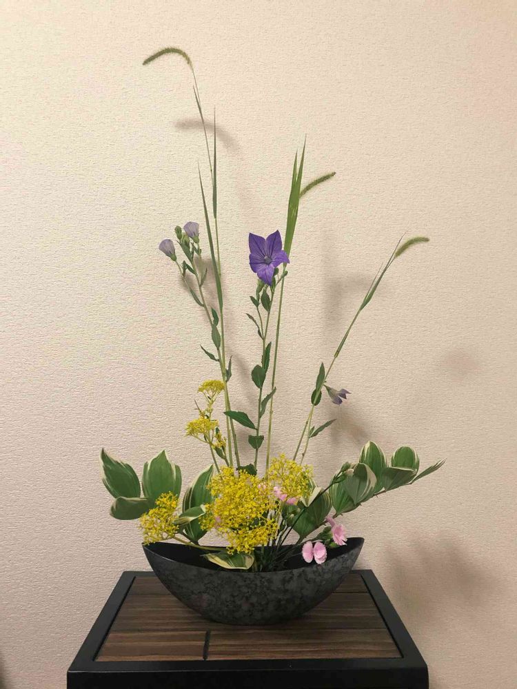 教室による花材。桔梗と猫じゃらしを中心に秋らしく縦の流れを作ってみたものの今回の花材には苦戦。スプレーカーネーションの使い方が毎回難しい。