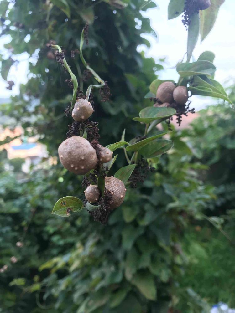 柚子や金柑や枝垂れ梅の木々に山芋のツルがカラムので被覆コードで二階ベランダへ誘導した山芋のツル束になるムカゴです
