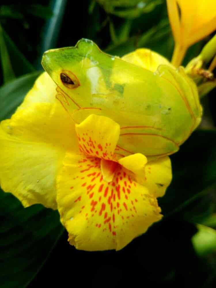 でも、黄色いカエルなんて聞いたことないし、擬態するなんて話も聞いたことない(私が知らないだけということもある)から、はて?と思った。