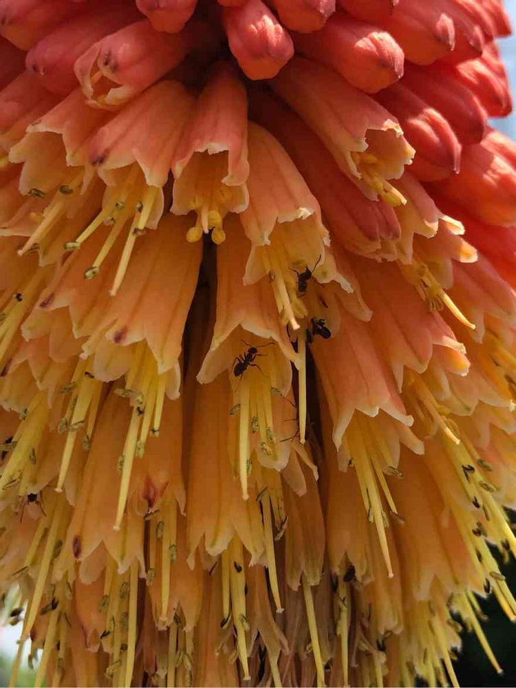 はじめこの赤いのが全体で花かと思っていたら、一つ一つがしかも下の方から咲いて、咲くと黄色くなるなんて😱