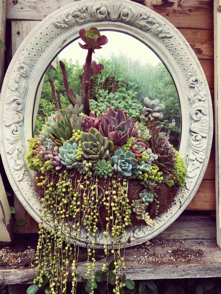 不思議の国のアリスに出てきそうな鏡に多肉の寄せ植えめちゃくちゃ可愛い❤ですね😉👍✨