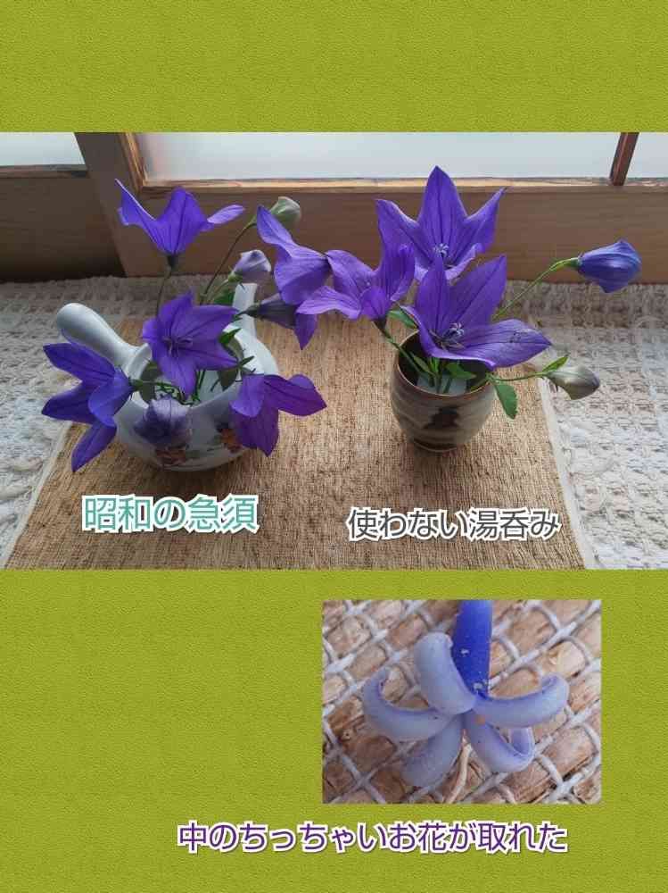 一重の桔梗は、和物がお似合いだと思い、『断捨離捨てようbox』🤣から、昭和感満載の急須と、いつだかフリマで購入した湯呑みを救出し、花器に生還👏