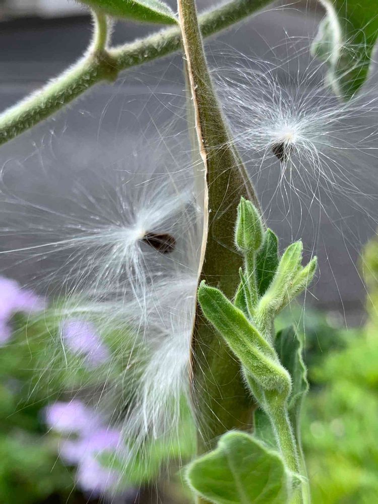 ブルースターの鞘が割れて、中からフワフワの毛⁈が付いた種が出てきました。そばには花芽もついています