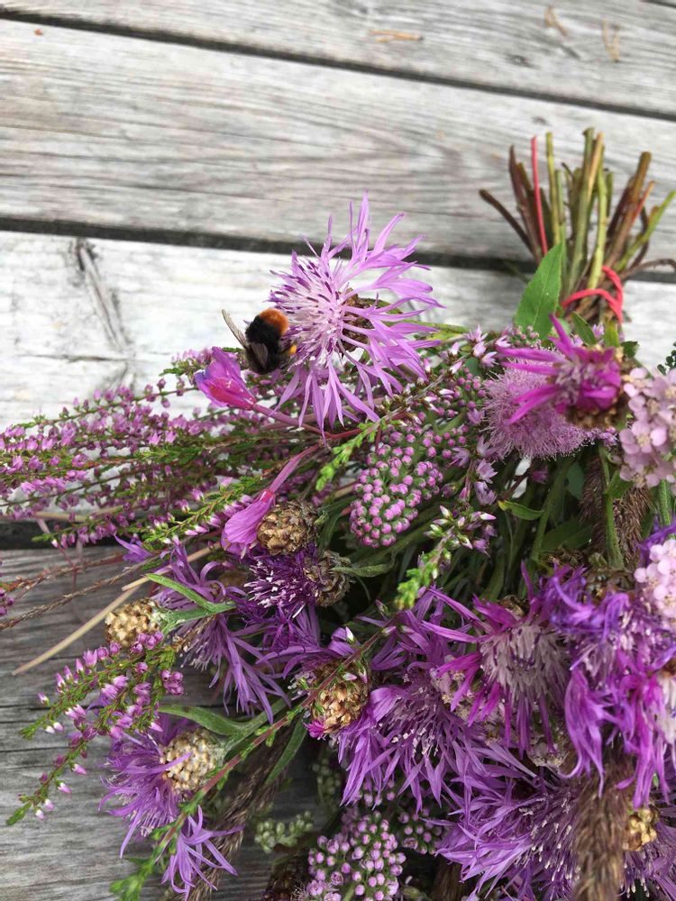 ヤグルマアザミ、ノコギリソウ、カルーナ、ホザキシモツケ、ヤナギランのブーケ。庭で写真を撮っていたら、早速働き者がやってきました。