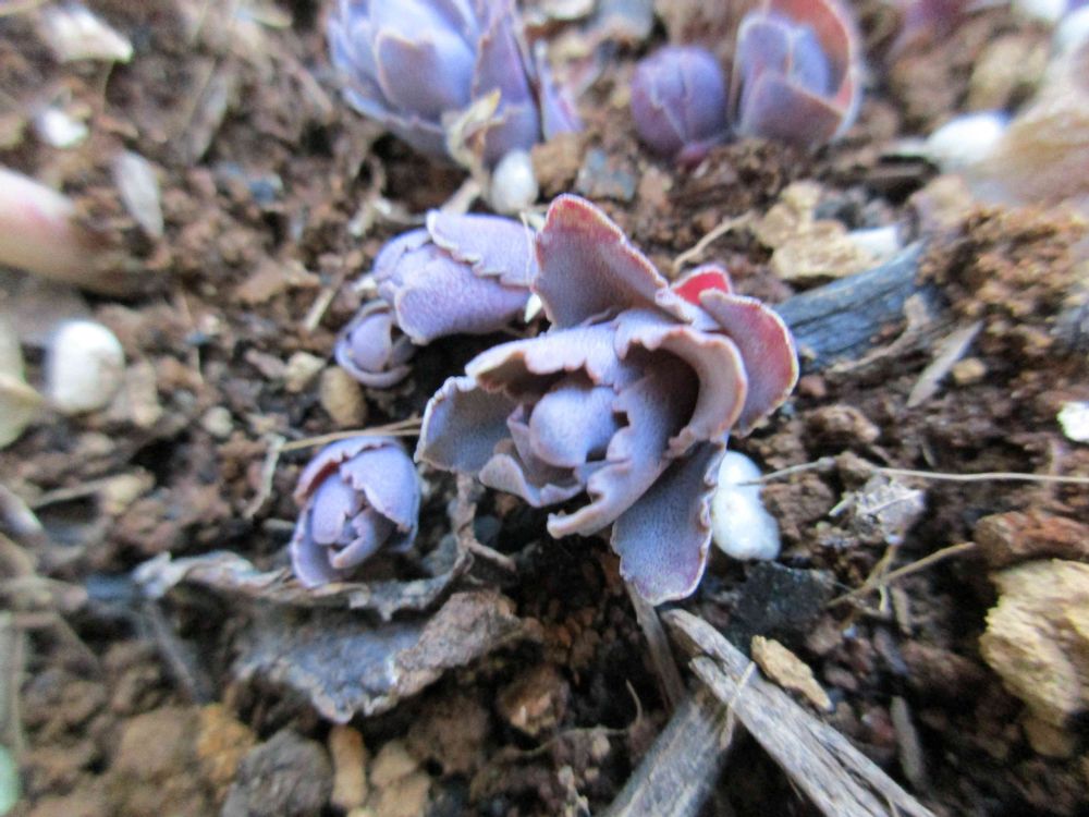 セダム・ストロベリー&クリームの枯れた根元に紫色の新芽が出てきました。