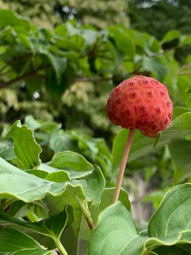 ヤマボウシの実、食べれるそうで甘味の少ない洋梨、真ん中に種があるそうです(ユーザーさんに教えていただきました)