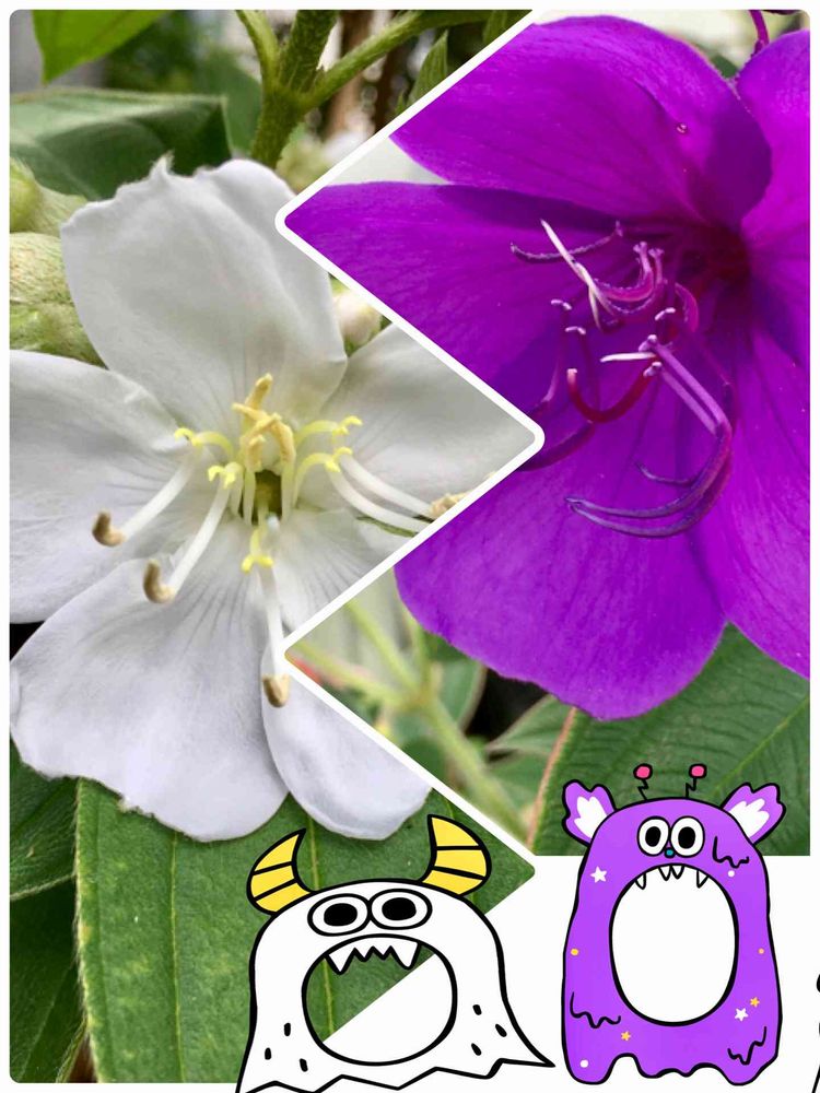 週末に行った公園の温室で見たんです、白いノボタン❣️ 真っ白なお花は目立ちますね💖 紫💜も出会ったばかり‼︎これは対比して⤴️‼︎ イラストは( ◠‿◠ )👌💕