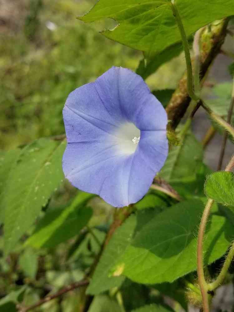 5月頃に河川敷の荒れ地で芽をだし双葉ぐらいの時におうちに連れて帰ってプランターに植えました。どんどん大きくなって丸めの大きな葉っぱも沢山繁り何が咲くのかなと思っていたら小さな水色の朝顔のような花が咲きました。