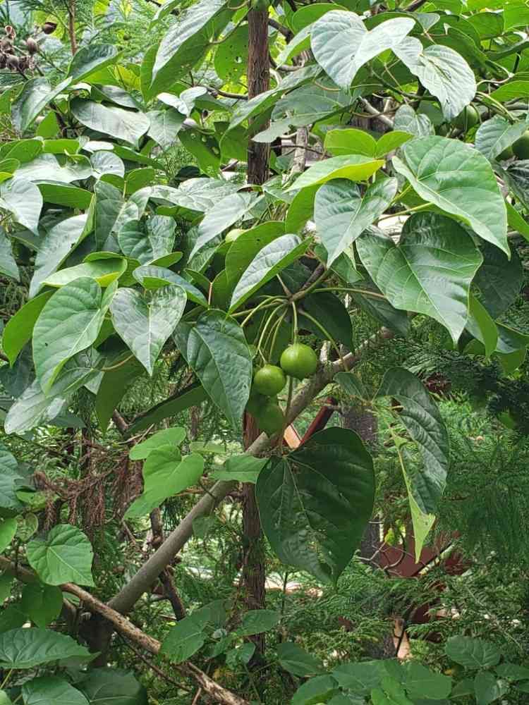 サツマイモみたいな葉っぱしてるけど。シナアブラギリと言う木らすぃ。。。シナは昔の中国の呼び名だそうで、中国のアブラギリと言う意味になるようです。(byネットより
