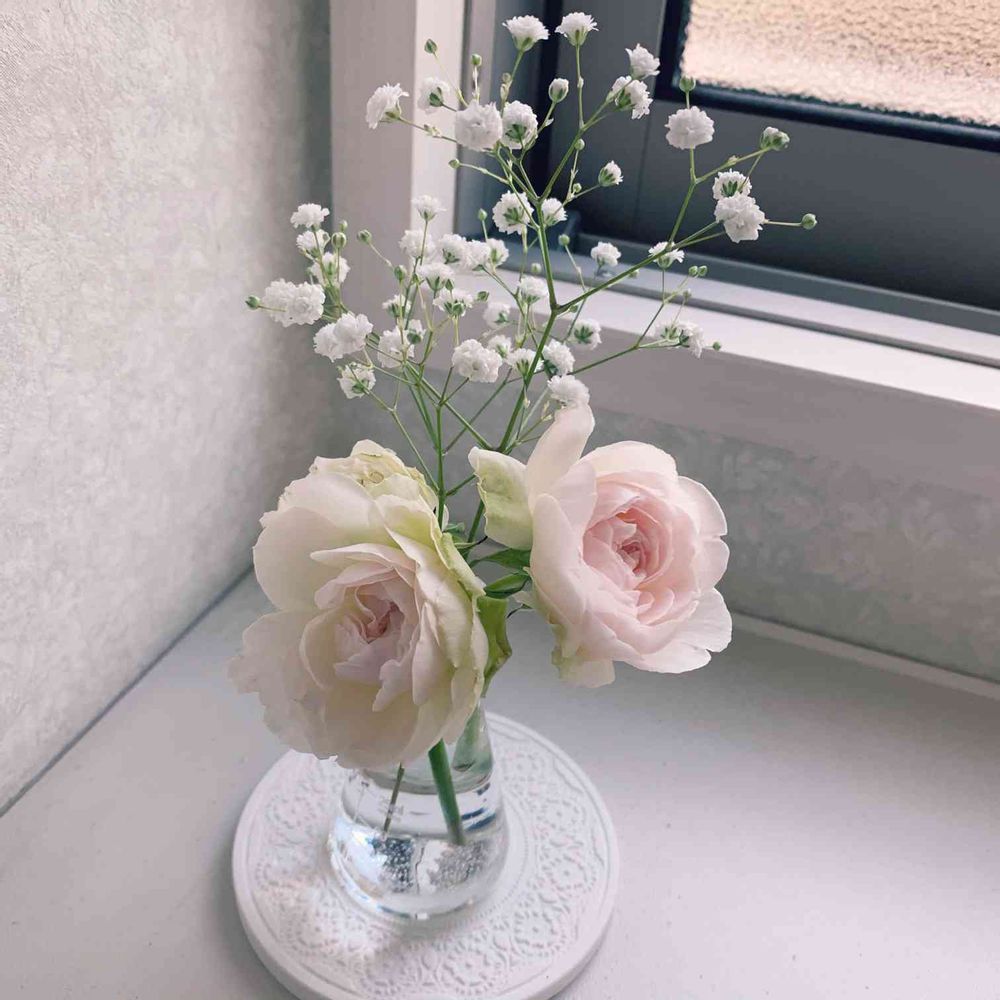 ネットで一目惚れ。探しまくってようやく手に入ったアッサンブラージュ♡短くて、切り花にしにくいんだけど、虫食いが激しくてほぼ葉がないので、蕾のうちに切ってみました。ダイソーで見つけた、小さなフラスコに飾ってみた。