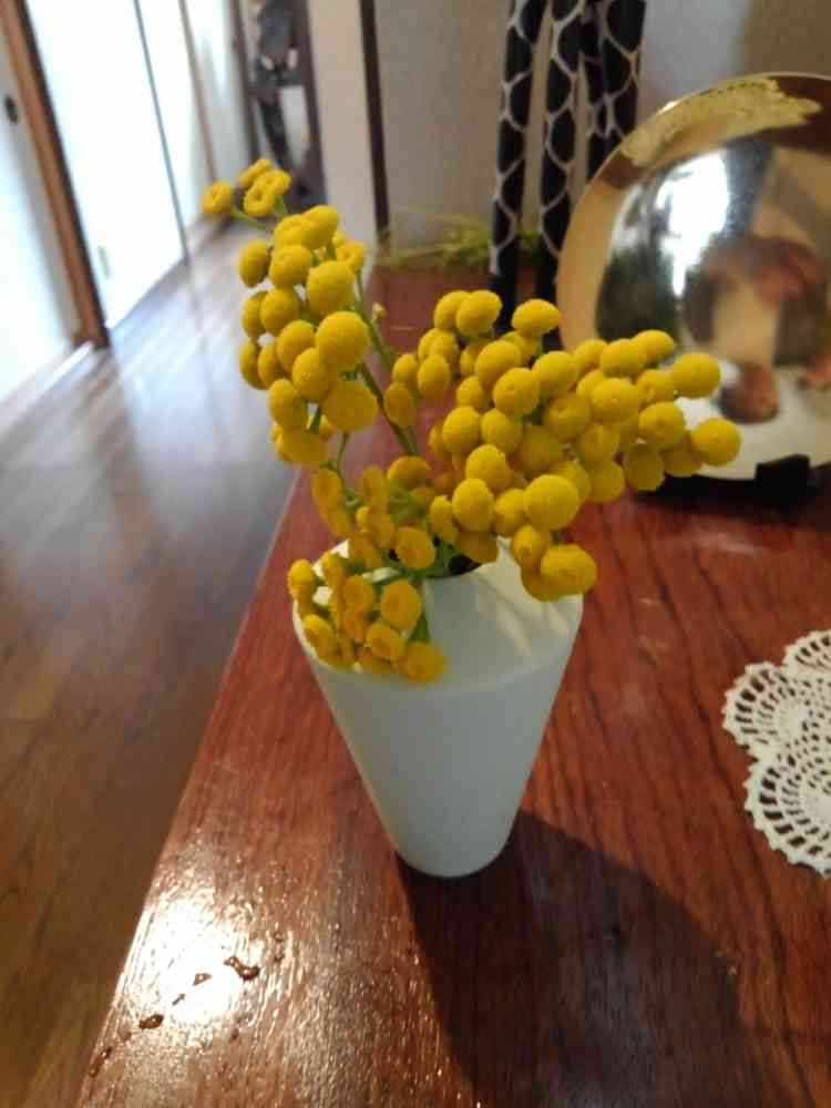 ぷくぷくお花、とても可愛い❤️庭に咲いてるタンジー、頭が重たそうなのでカットして花瓶にさしました。濃い黄色でポコポコでキュートなのにすっごい臭い❗ネズミ避けになると聞いて迷わず買ったけど、なるほど