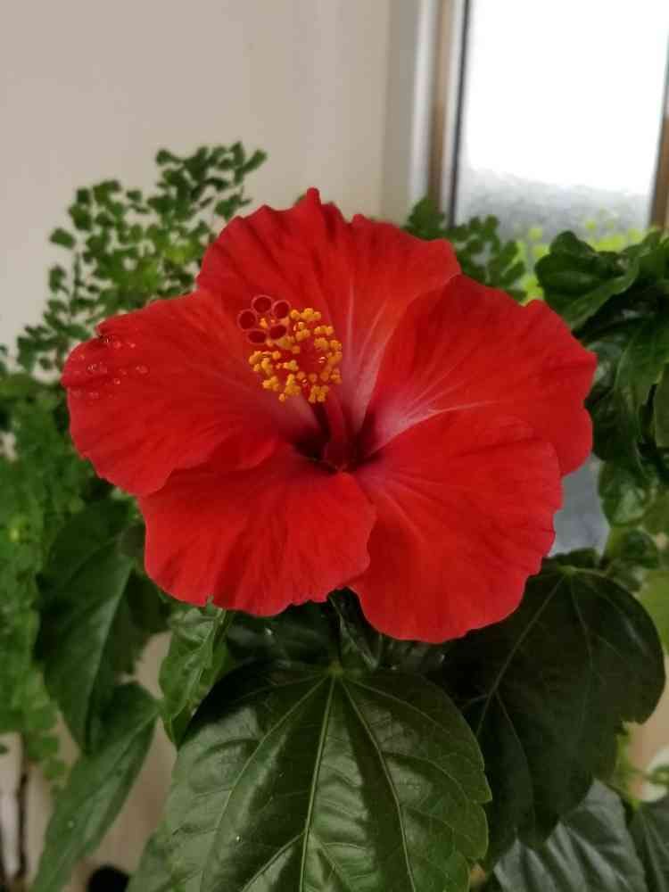 咲き終わった黄色のハイビスカスを、軒下の棚に、戻し、赤いハイビスカスを、部屋の中に、移動させました。