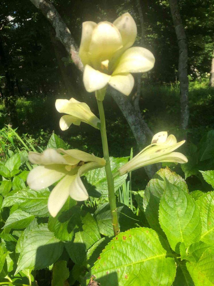 散歩の途中で見つけたお花…林の中にすーっと背筋の伸ばしてまっすぐ上を向いて、薄いクリーム色ゆりのようなお花を咲かせていました。華やかなヤマユリもいいけど、こちらも雰囲気があって素敵✨なまえ