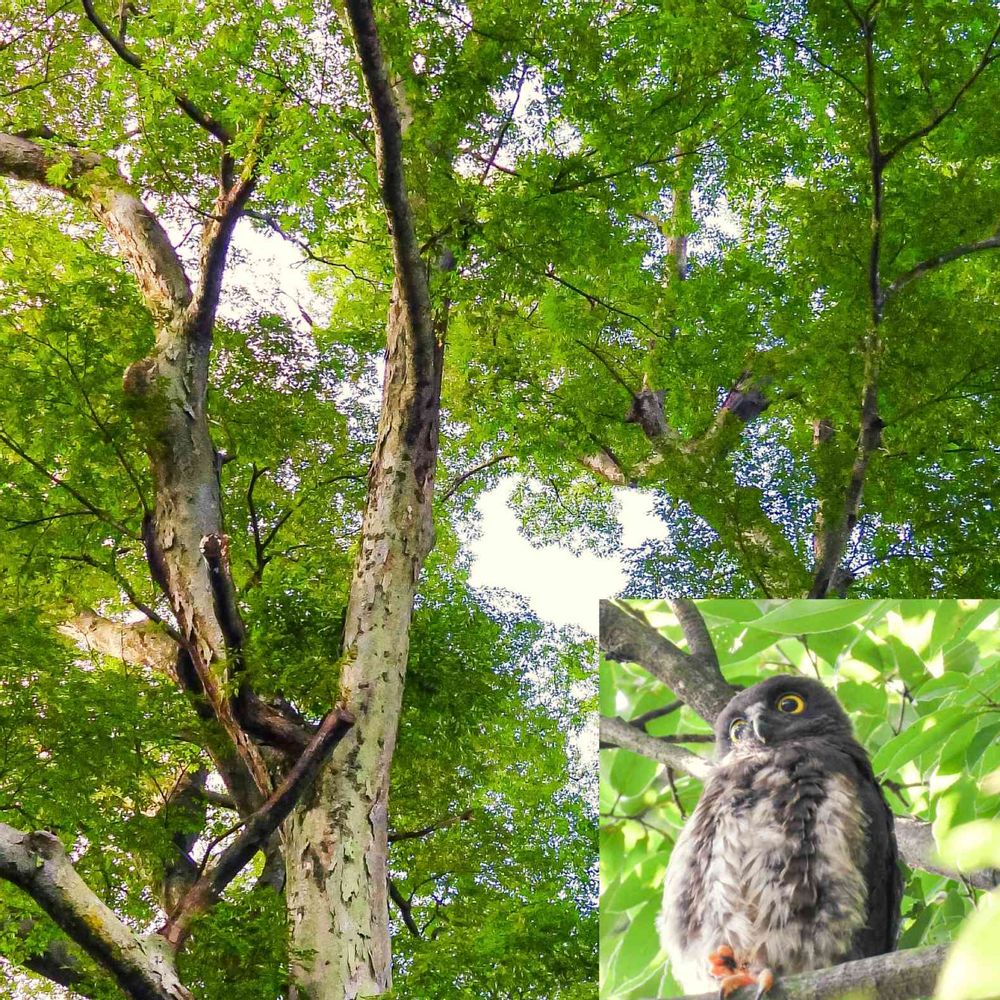 入れ代わり立ち代わりカメラ📷を持った人が訪れ、アオバズクのヒナがいる木を囲んでいました。
